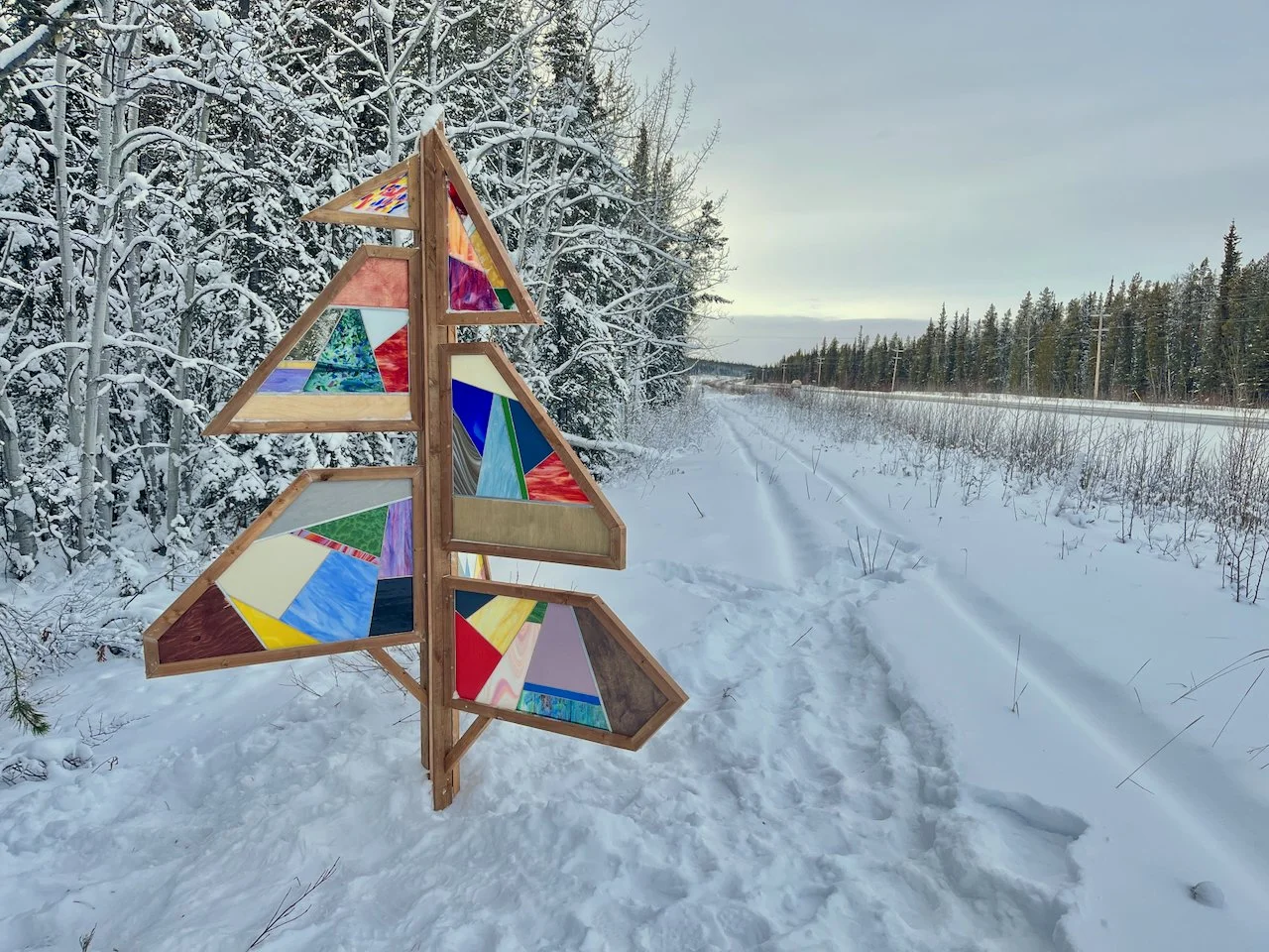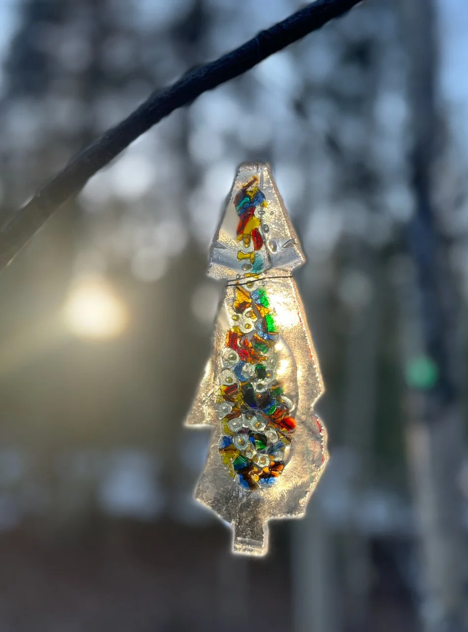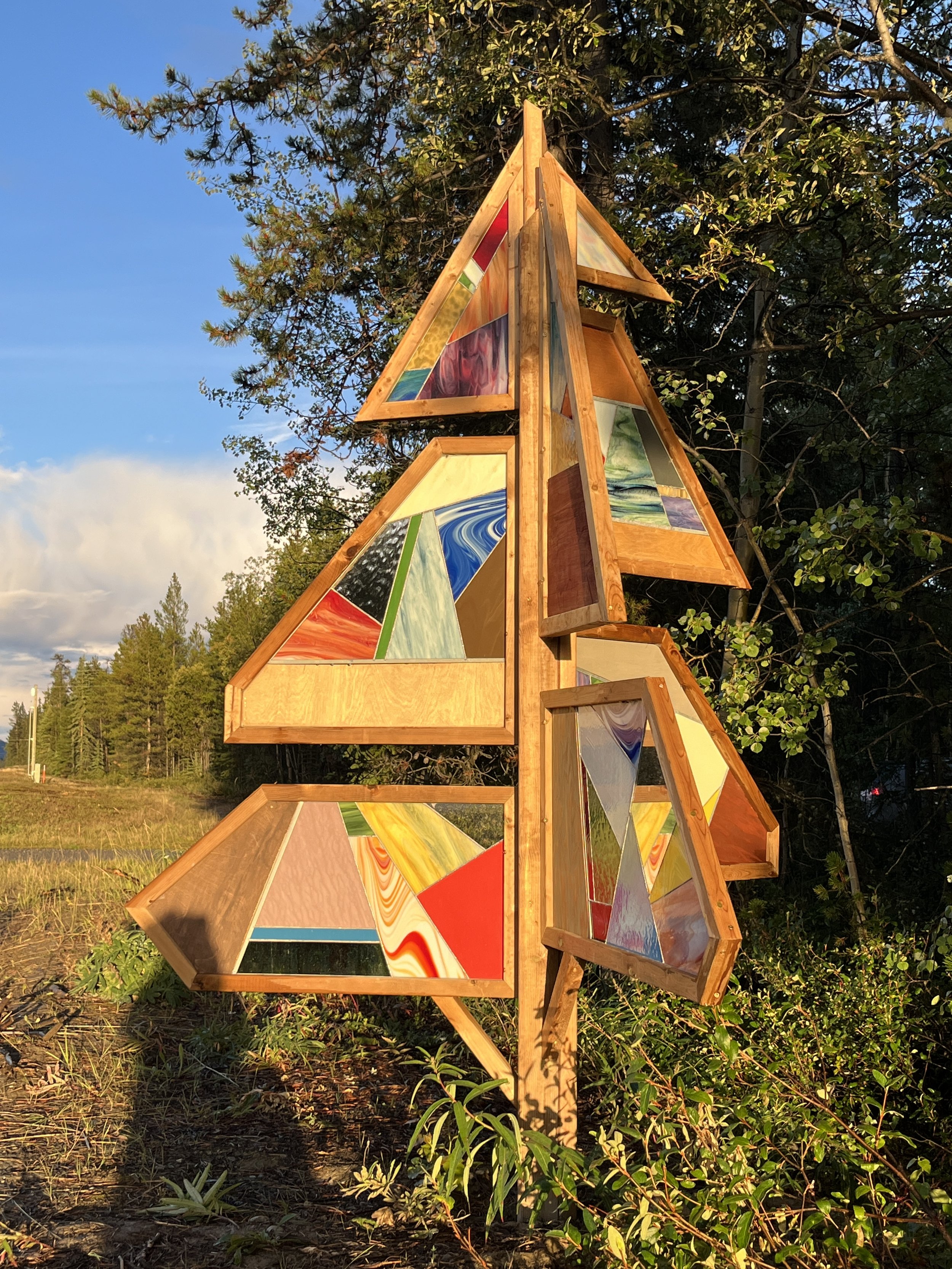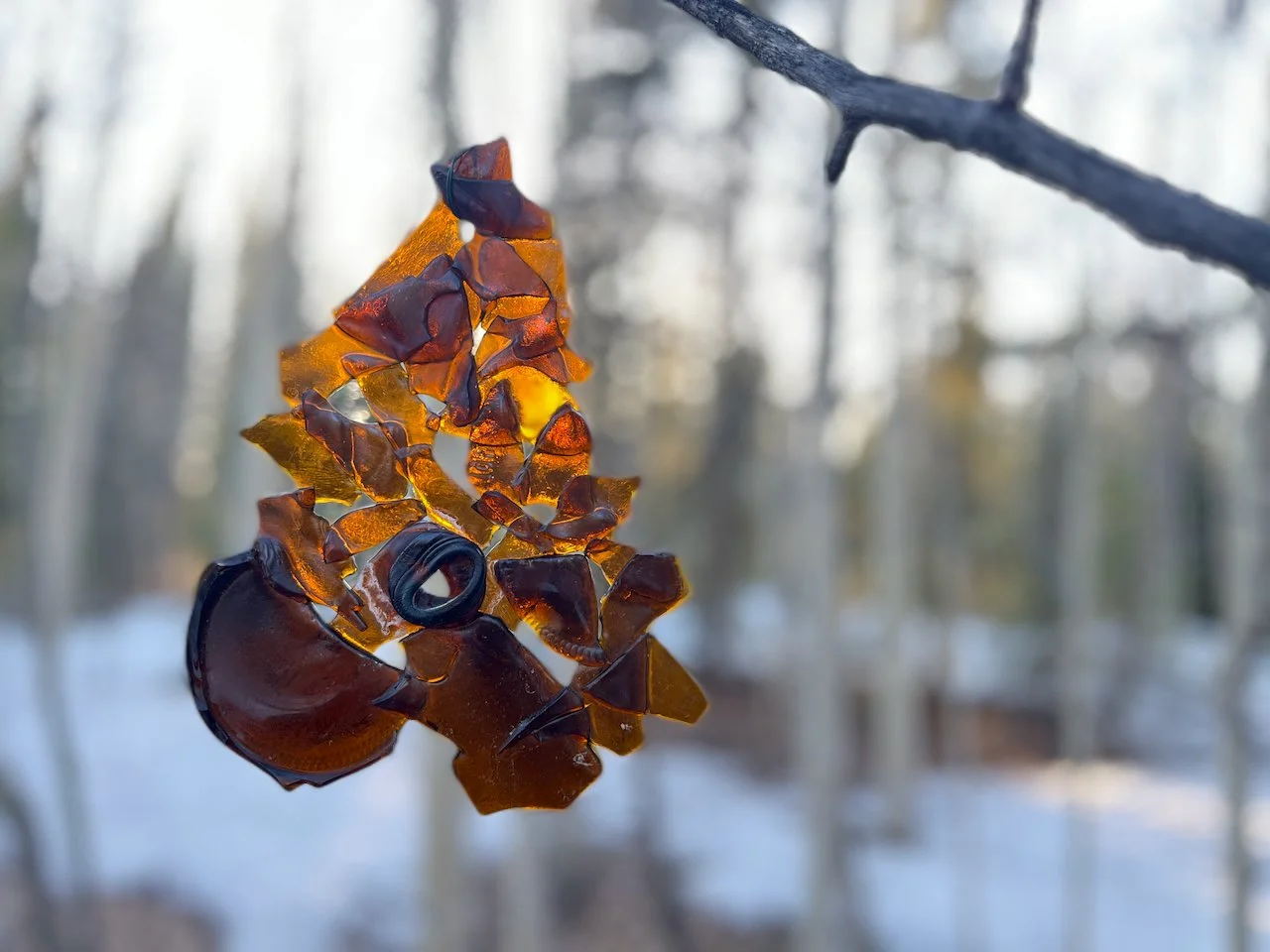 Below is a short video of a glass tree installation in the woods behind our house. A few were co-created with my husband Jayden Soroka from recycled glass during a workshop with local artist Nicole Bauberger. Jayden also made the wood trunk and wooden frames for the large glass tree sculpture by the side of the highway.